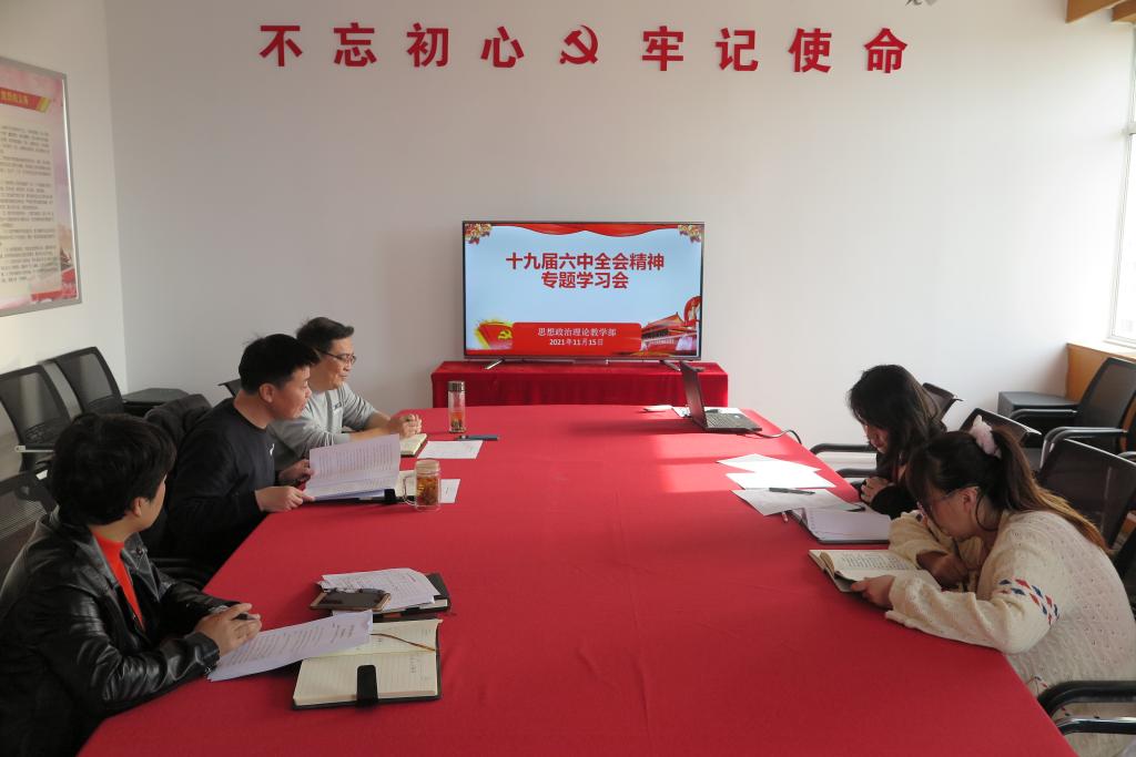 2021年11月15日,思想政治理论教学部(以下简称“思政部”)召开会议,认真传达学习贯彻党的十九届六中全会精神,研究贯彻落实意见。思政部党总支成员、入党积极分子代表、教师代表参加会议。会议由思政部党总支书记党胜利主持。